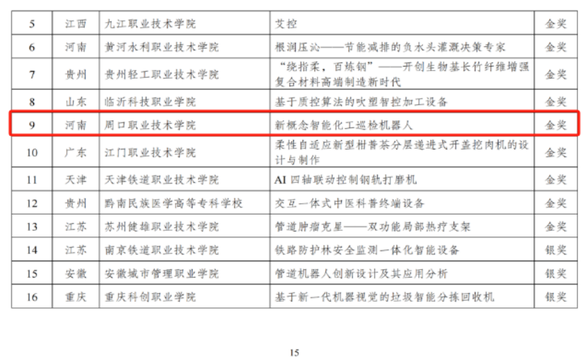 第十八届“振兴杯”全国青年职业技能大赛学生组创新创效竞赛全国决赛于11月9日至11日在河南郑州举行。经过省赛、全国预选赛多轮角逐,共有来自全国26个省份的241件作品入围全国总决赛,其中中职组作品88件,高职组作品153件,涵盖技术革新、创意设计和管理创新3个竞赛方向。经过激烈竞争比拼及专家层层评审,十大买球的正规网站由张矿伟、轩立两位老师指导,任俊臣、卜焱等同学设计的《新概念智能化工巡检机器人》项目在高职组创意设计类赛项中以全国第九名的优异成绩荣获金奖。