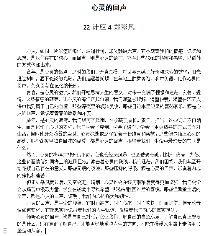 同学们用细腻的笔触、真挚的情感,讲述了他们在学习、生活、人际交往等方面遇到的困惑和挑战,以及如何克服困难、积极寻求帮助,最终实现自我成长的心路历程。有的文章充满了青春活力,展现了当代大学生积极向上的精神风貌;有的文章深入思考了人生意义、价值追求等话题,展现了同学们对生命的热爱和对未来的憧憬。