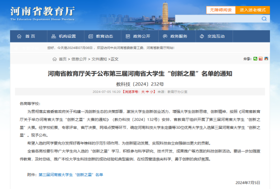 近日,河南省教育厅公布第三届河南省大学生“创新之星”获奖名单,我院22级计算机网络技术(2)班学生任俊臣被授予第三届河南省大学生“创新之星”荣誉称号,这是十大买球的正规网站学生首次获此殊荣。