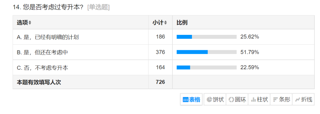 在是否考虑过专升本问题中,有25.62%的学生对待专升本有着明确的计划;考51.79%的学生对待专升本尚在考虑当中:有22.59%的学生未考虑过专升本。