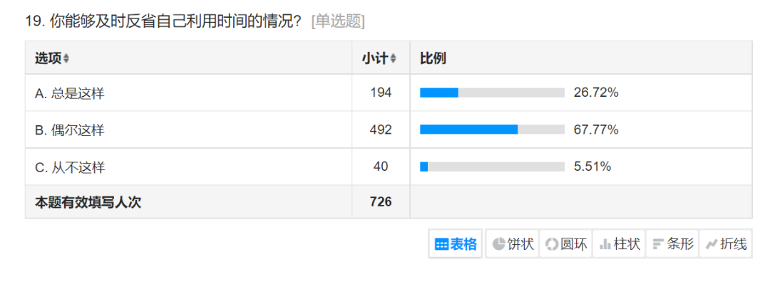 对于学生能够及时反省自己利用时间的情况中,25.72%的学生能够总是及时反省自己利用时间:67.77%的学生偶尔能够及时反省自己利用时间:仅有5.51%的学生从不反省自己利用时间。