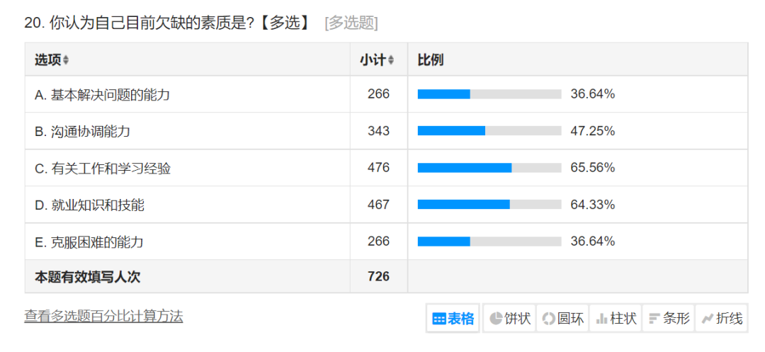 在学生们目前认为个人欠缺的素质调查中,认为欠缺基本解决问题的能力的学生占比36.64%;欠缺沟通协调能力的学生占比47.25%;欠缺有关工作和学习经验的学生占比65.56%;欠缺就业知识和技能的学生占比64.33%;欠缺克服困难能力的学生占比36.64%。