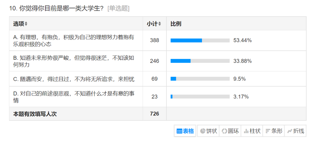 对于个人属于哪一类大学生问题中,有理想,有抱负,积极为自己的理想努力着抱有乐观积极的心态的学生占比53.44%;知道未来形势很严峻,但觉得很迷茫,不知该如何努力的学生占比33.88%:随遇而安,得过且过,不为将无所追求,来担忧的学生占比9.5%。