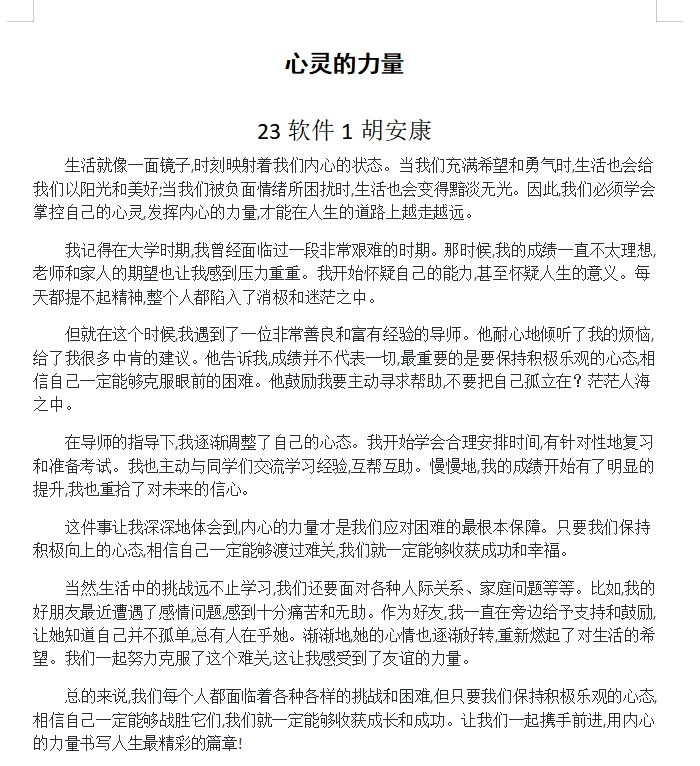经过为期一周的征文,学院共收到近百篇优秀作品。经过评审,最终评选出一等奖3篇、二等奖5篇、三等奖10篇,并给予适当的精神奖励。获奖作品反映了同学们对心理健康的深入思考,展现了他们积极向上、勇于自我探索的精神面貌。