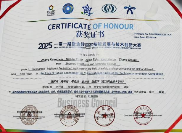 竞赛赛场上,周自杰带领团队啃教材、析案例、勤复盘,从专业“小白”蜕变为科创能手。其团队研发的“智能消防头盔”获5项实用新型专利,还斩获中国国际大学生创新大赛铜奖、一带一路暨金砖国家技能赛事国赛一等奖等荣誉,相关事迹获20余次媒体报道。