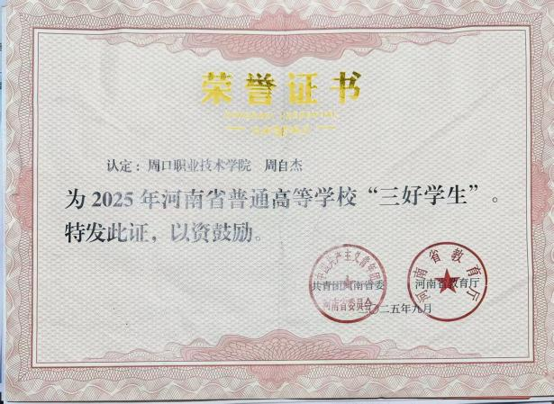 三代从军的家庭氛围,让周自杰自幼怀揣军营梦。他连续3年报名参军,历经近视、超重等挫折后,通过手术、健身等努力,终于在2021年圆梦军营。在部队炊事班岗位上,他凭借坚持拿下炊事比武第一,年夜饭获领导肯定,领悟到平凡岗位亦能创造不凡。退役复学后,面对学业断层困境,周自杰制定分阶段学习计划,坚持365天打卡学习,实现学业逆袭,综合成绩连续两年稳居班级第一,斩获国家励志奖学金并获评“三好学生”。