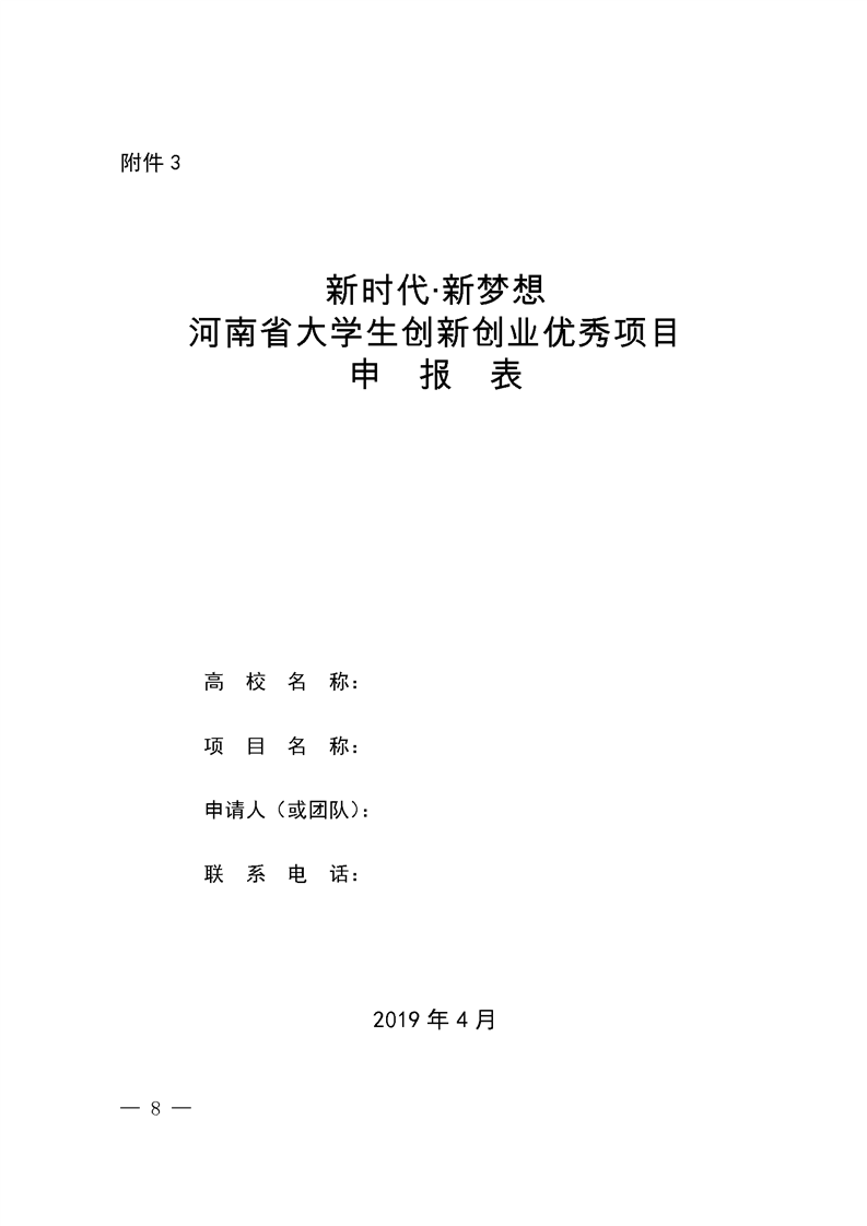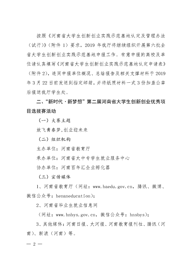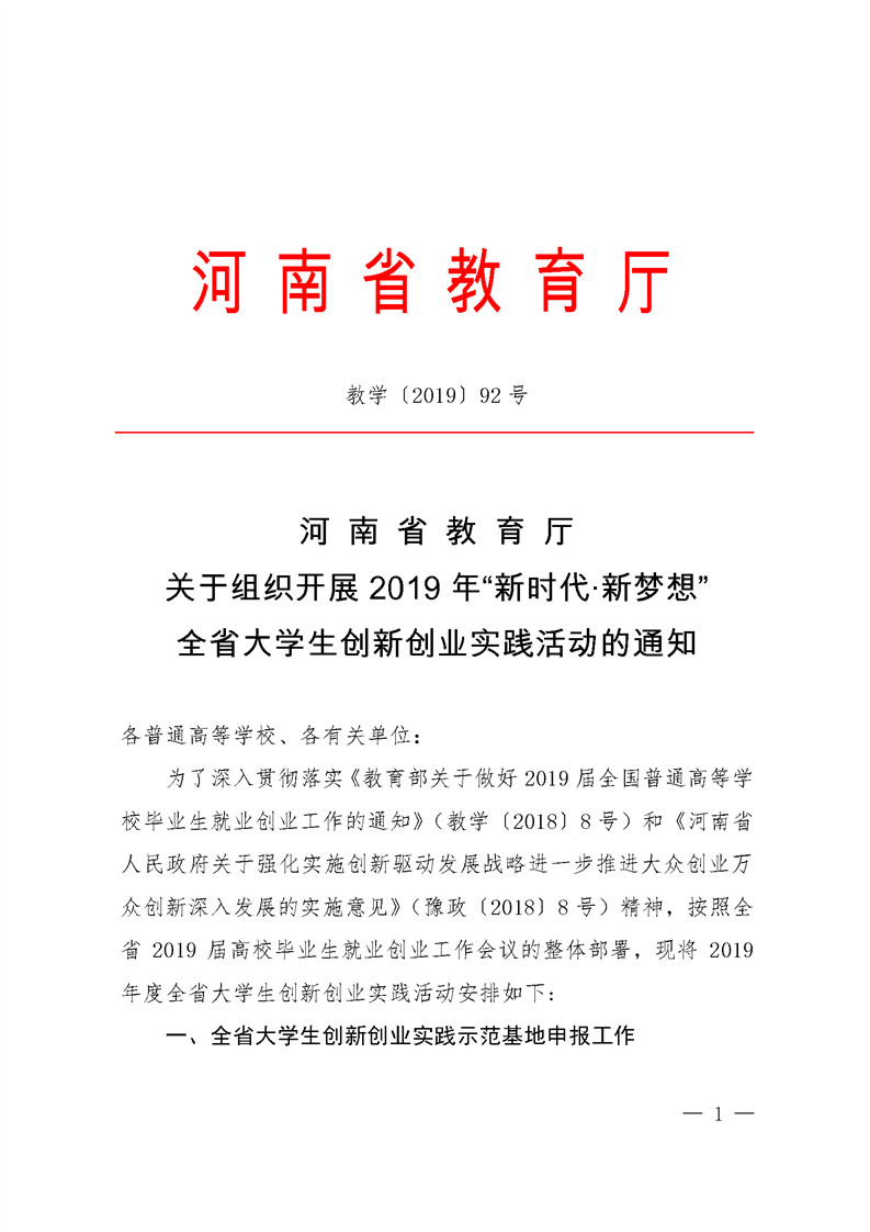 河 南 省 教 育 厅 关于组织开展2019年“新时代·新梦想” 全省大学生创新创业实践活动的通知