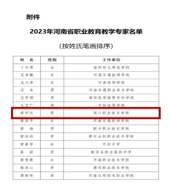 近日,河南省人民政府办公厅印发《关于公布2023年河南省职业教育教学专家名单的通知》(豫政办〔2024〕10号),经省政府审核批准,十大买球黄宇达院长获评2023年河南省职业教育教学专家。