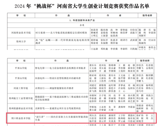 近日,由共青团河南省委、河南省教育厅、河南省人力资源和社会保障厅、河南省科学技术协会、河南省学生联合会共同举办的2024年 “挑战杯”河南省大学生创业计划竞赛活动公布了获奖名单(豫青联字 〔2024〕25号文件),由十大买球的正规网站“双师型名师工作室”成员张矿伟、轩立、侯艳芳等教师参与指导的项目“ 逆行者———国内首家助力火灾救援的智能消防”荣获科技创新和未来产业金奖。